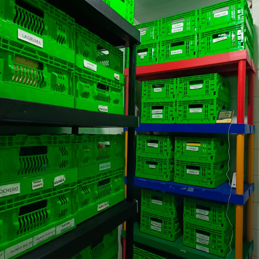 The harvested peppers then undergo seed extraction - the process that determines the future of our production. At UCHU, we do this technique for over 102 varieties of peppers, each with its unique characteristics and requirements. Each fruit contains the potential for dozens of future plants, making this step vital for maintaining our seed quality, but also for preserving the biodiversity of peppers. Our in-house team maintains strict process controls throughout the extraction, ensuring that every seed we produce is viable and ready to germinate as soon as it touches soil and water. The seeds are then stored under controlled conditions in multiple locations, safeguarding their future.